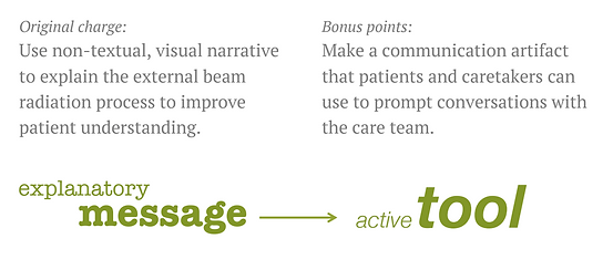 When patients present to the radiation oncology clinic for the first time they often know very little about external beam radiation, the associated treatment process, and what to expect. Our job will be to design a visual narrative that will help physicians and nurses communicate important information about the radiation treatment process to patients.